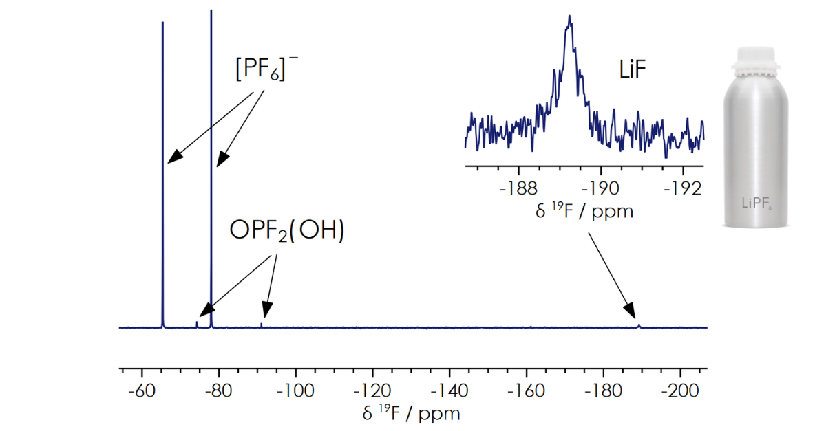 図2は、エチルメチルカーボネートとエチレンカーボネートの混合溶媒を用いた六フッ化リン酸リチウム(Li [PF6])系電解液の充放電性能を低下させた故障の原因をNMRで特定したものです。まず、基準サンプルとの比較により、溶媒が原因ではないと判断されました。図2のNMRスペクトルによると、加水分解反応が起こり、元々あった [PF6]− の一部がジフルオロリン酸 (OPF(OH)2 ) に変換され、残りの(純粋な)リチウム電解質種に対するモル比が0.6になったことが確認できます。さらに、この加水分解反応の既知の副生成物であるフッ化リチウム (LiF) が、望ましくない形で生成されてしまいます。