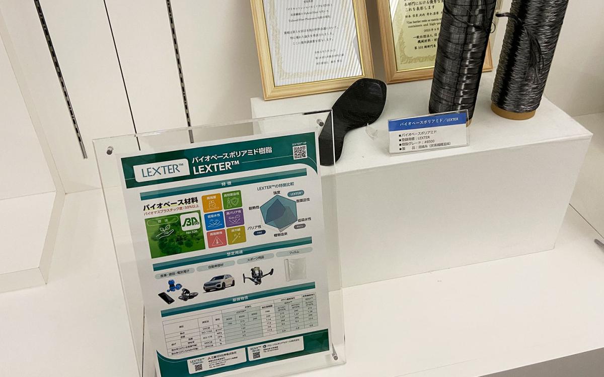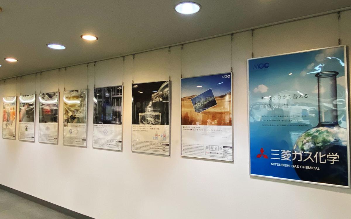 平塚研究所(写真左)、三菱ガス化学の事業・製品・研究開発を紹介したパネルやディスプレイ(写真中央と右)