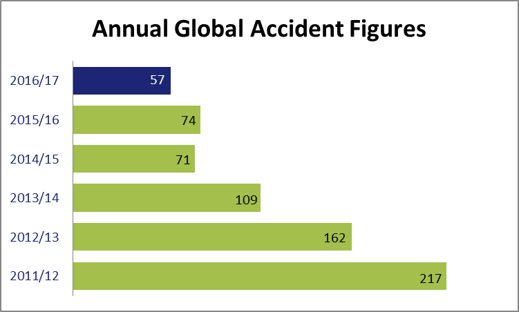 The total number of accidents recorded worldwide during 2016/17 showed a significant fall to 57 compared with 74 in the previous year. The substantial reduction in accidents over the previous five years has been broadly maintained. This demonstrates our commitment to the Health and Safety of our staff, which we take very seriously and work hard together as a team to effect improvements. Our sites are operating in as safe a manner as possible with the majority of accidents recorded being very minor cuts and bruises.