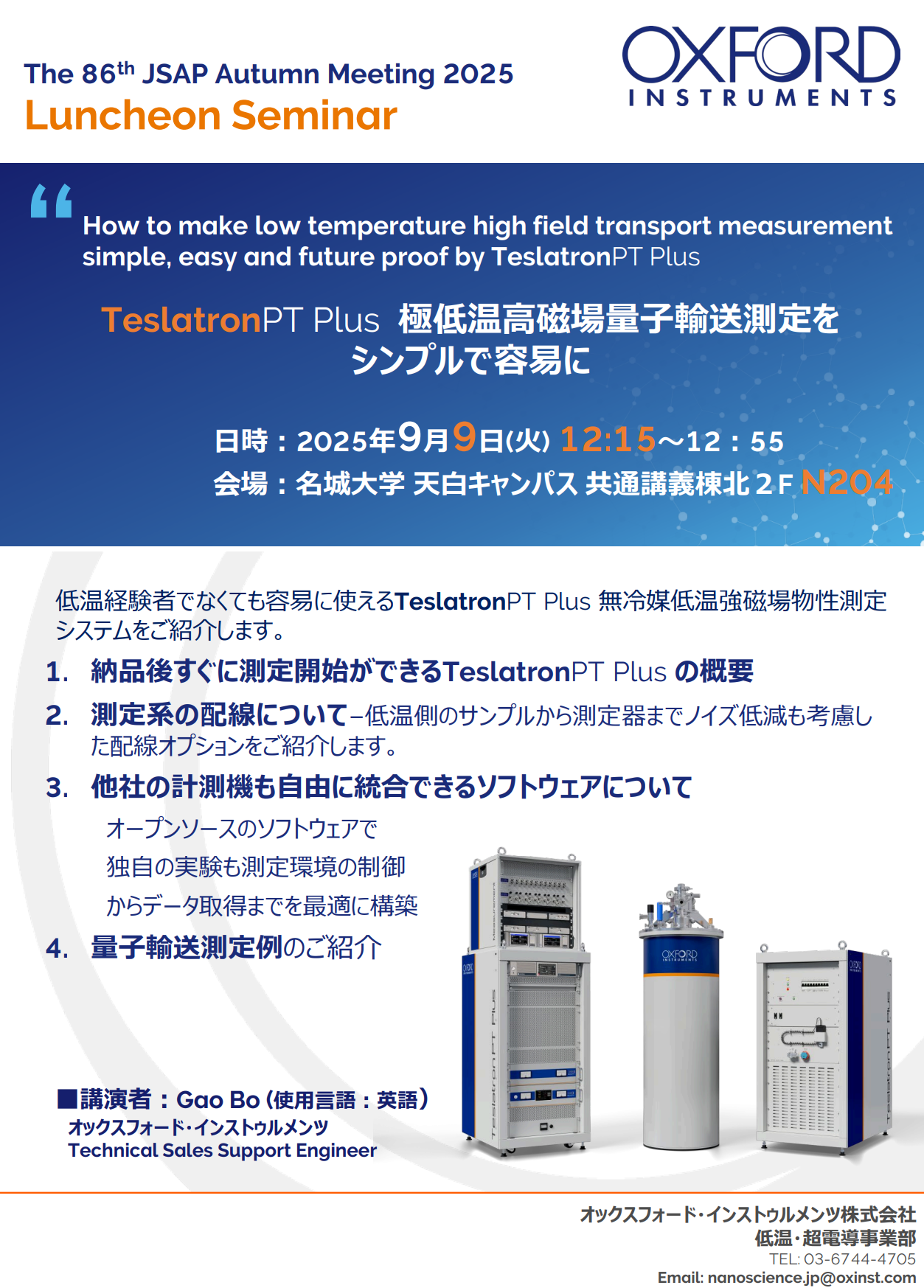 - 演題:「TeslatronPT Plus 極低温高磁場量子輸送測定を シンプルで容易に」