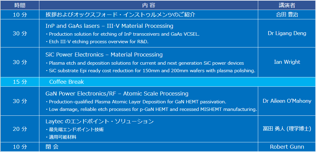 ますます注目される半導体産業において新しいプロセス技術が要求され、オックスフォード・インストゥルメンツ・プラズマテクノロジーは装置メーカーとして独自の技術を開発しています。この度、英国本社からプロダクトマネージャーが来日し、SiC や GaN パワーデバイス、高速通信、光電融合技術に対応した光通信デバイスなどに向けた最新プロセス技術について技術セミナーを開催いたします。深くご理解いただけるよう日本語通訳ありのセミナーです。また情報交換の時間も設けておりますので、皆様お気軽にご参加ください。