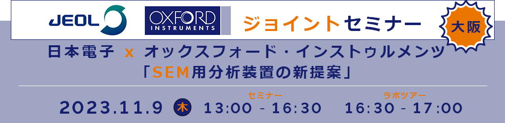 2023年11月9日(木)、日本電子株式会社とオックスフォード・インストゥルメンツ株式会社は、「SEM用分析装置の新提案」をテーマとしたジョイントセミナーを大阪で開催します。