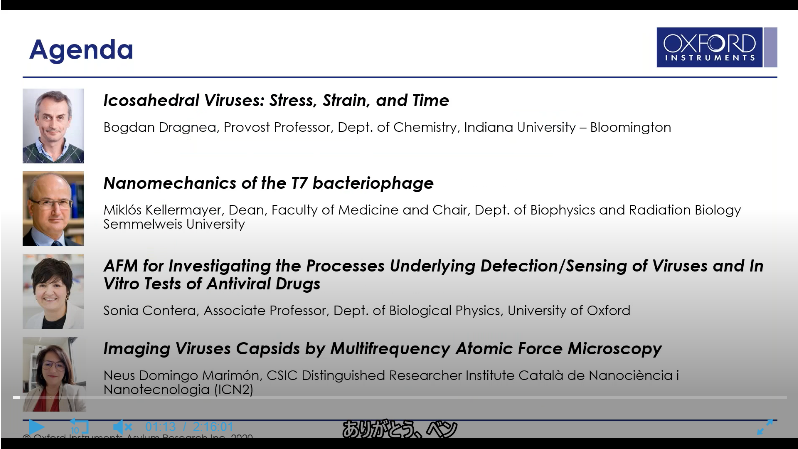 製品詳細/お問い合わせ米国で開催されたオンラインシンポジウム「生物研究分野における原子力間顕微鏡の応用」(約2時間,日本語キャプション付き) を配信いたします。ウイルス研究にAFMを活用している4名の研究者の講演をご視聴いただけますのでこの機会に是非ご利用ください。