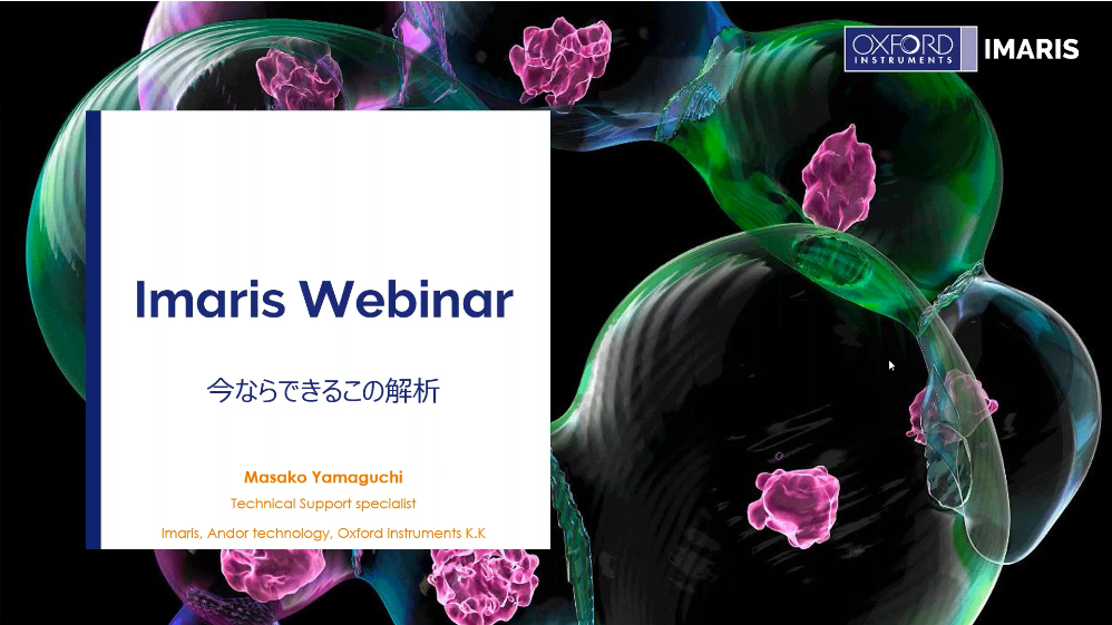 製品詳細/お問い合わせより簡単に多次元撮影が出来る今、画像の役目として雄弁な視覚化に加えて、その情報解析がさらに重要視されています。撮影方法と同様に、その解析環境も進化をとげています。本ウェビナーではImarisの画像解析機能をご覧いただくくことで、3D解析の「今」をご紹介いたします。